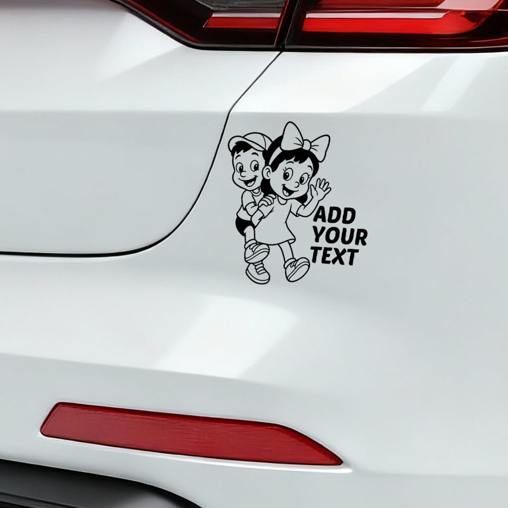 This Baby on Board car sticker features a playful illustration of a cheerful boy and girl walking together, making it a perfect choice for families who want a cute and friendly warning sign on their vehicle. The girl’s big bow and happy expressions add a fun, child-friendly look that stands out on any car.