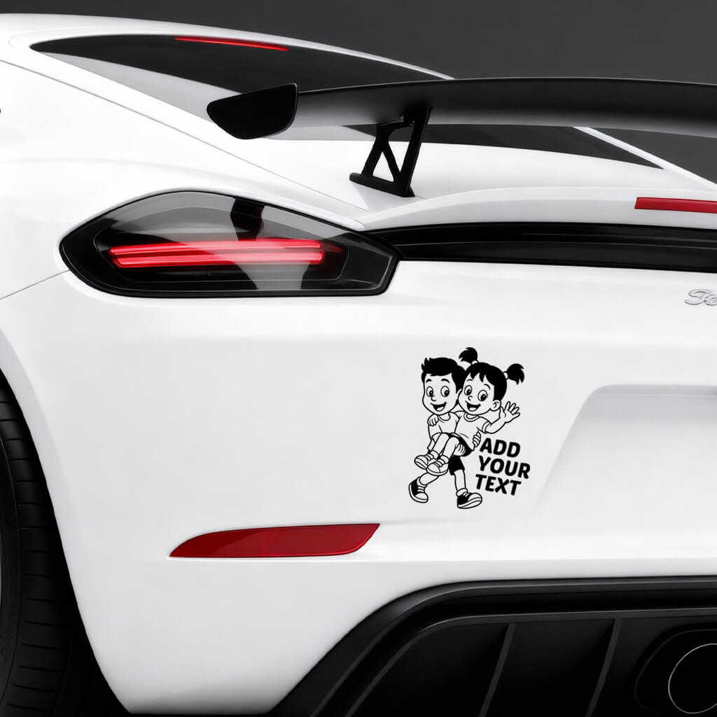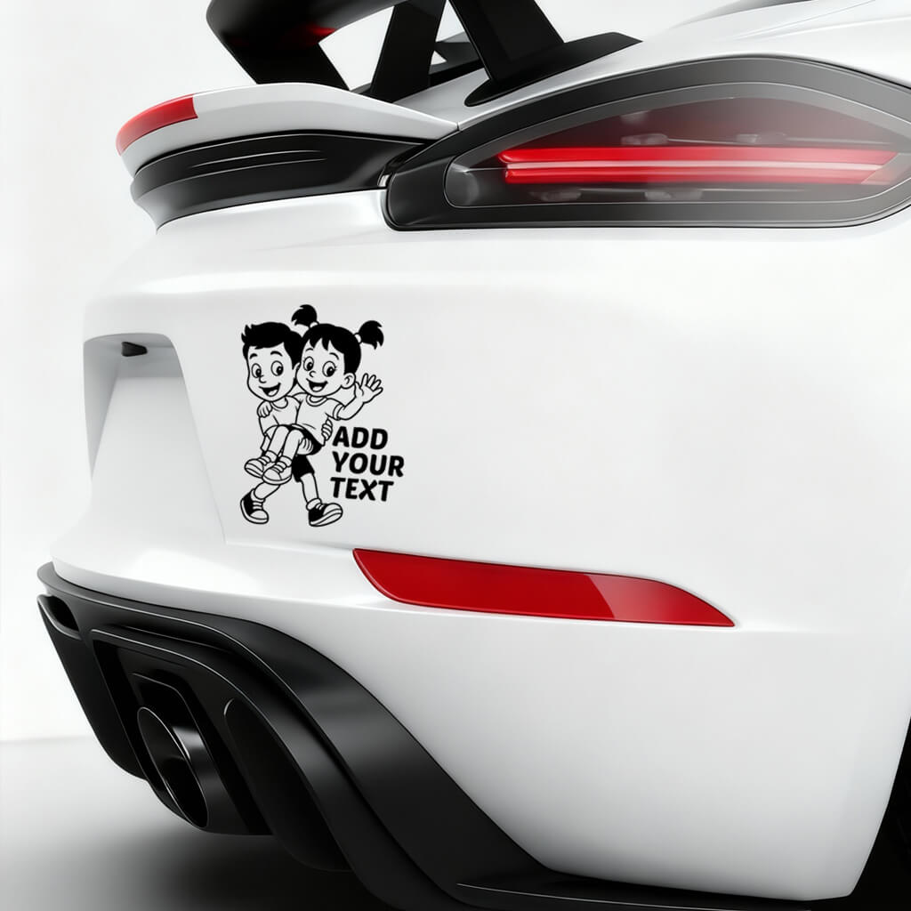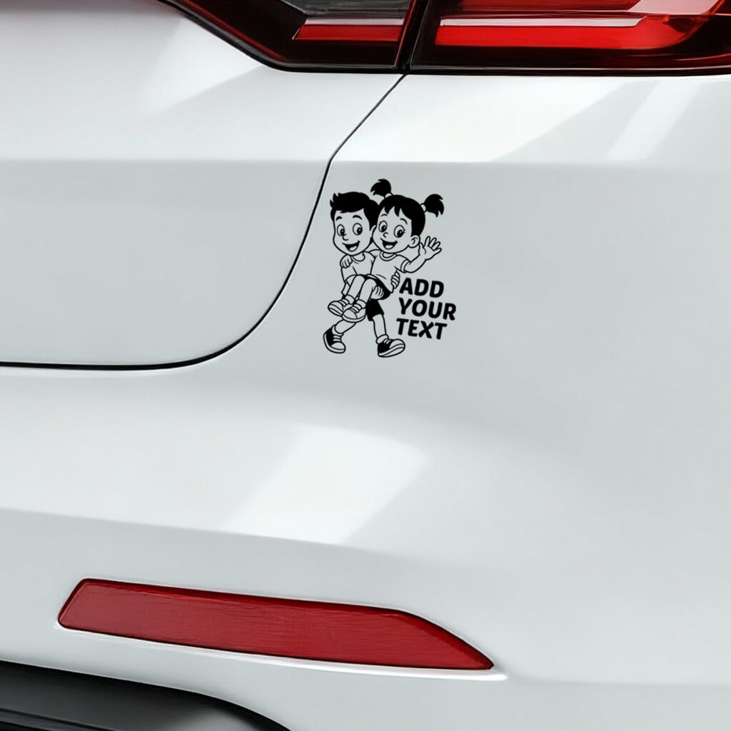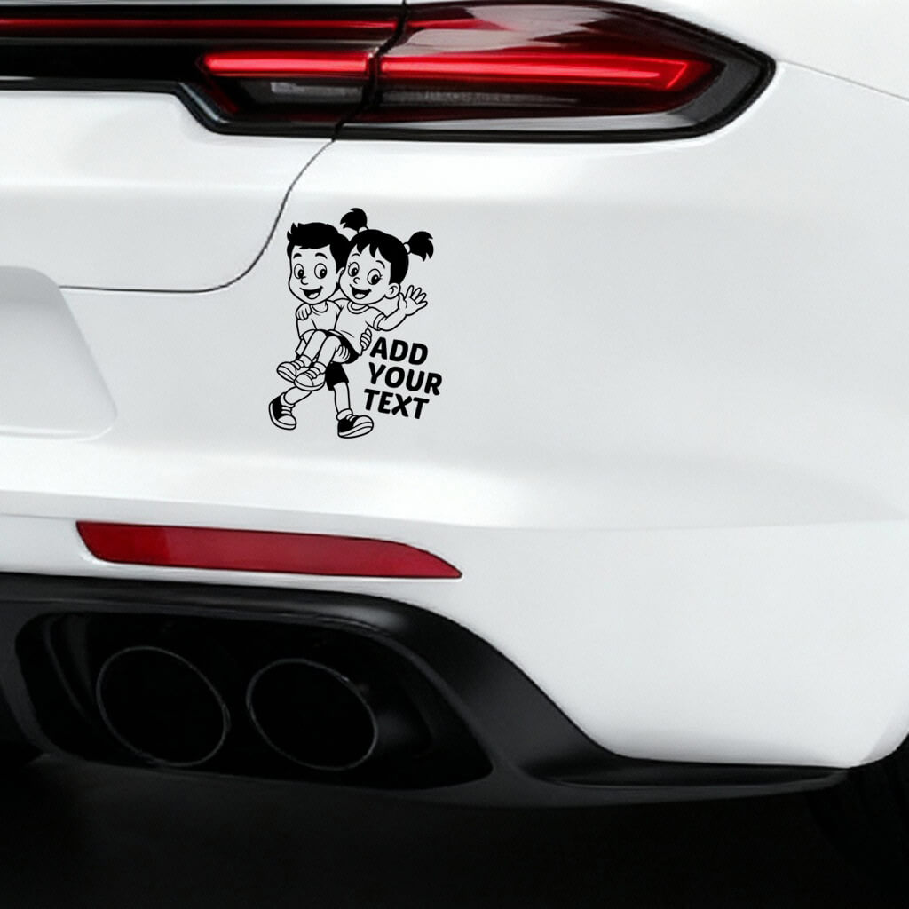 This heartwarming Baby on Board car sticker shows a smiling boy carrying a cheerful girl in his arms, both full of joy and energy. Their playful expressions and dynamic pose make it a perfect sticker for families who love fun, caring designs.