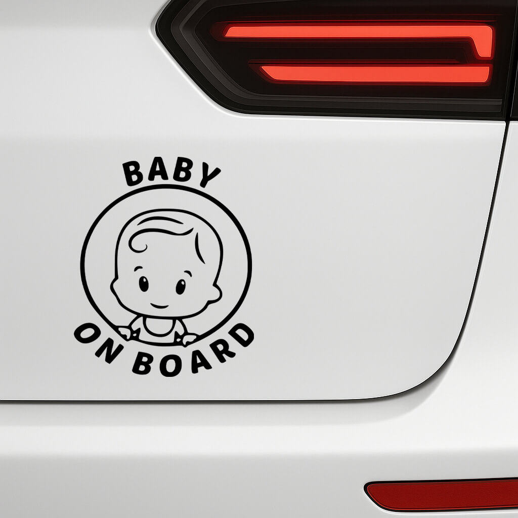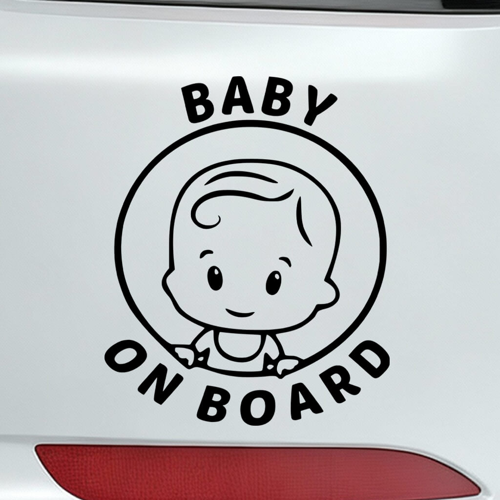 This Baby on Board car sticker features a cute smiling baby face framed inside a circular border, with bold “BABY ON BOARD” text wrapping around the design. The round layout gives it a balanced, polished look that’s instantly recognizable, making it easy for other drivers to notice from a distance.
