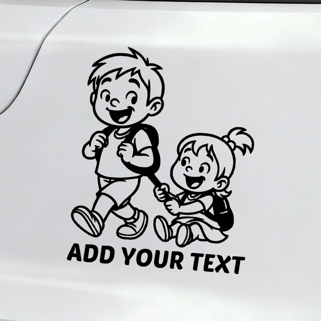 This adorable car sticker captures a joyful boy walking ahead while a happy girl playfully holds onto a rope. A perfect design for family cars that highlights sibling fun, laughter, and cheerful energy on every ride.