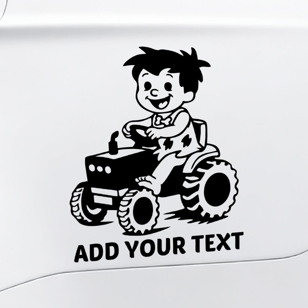 This car vinyl decal shows a smiling cartoon boy in a Flintstone-style outfit riding a simple tractor, designed with bold outlines for clear visibility. The prehistoric theme combined with a farming motif makes it suitable for agricultural enthusiasts, families, or personalized vehicles with a rural or playful character. The decal is made for exterior vehicle use and applies cleanly to car body panels, bumpers, or windows. It is produced from durable outdoor vinyl intended to withstand regular weather exposure on smooth surfaces.