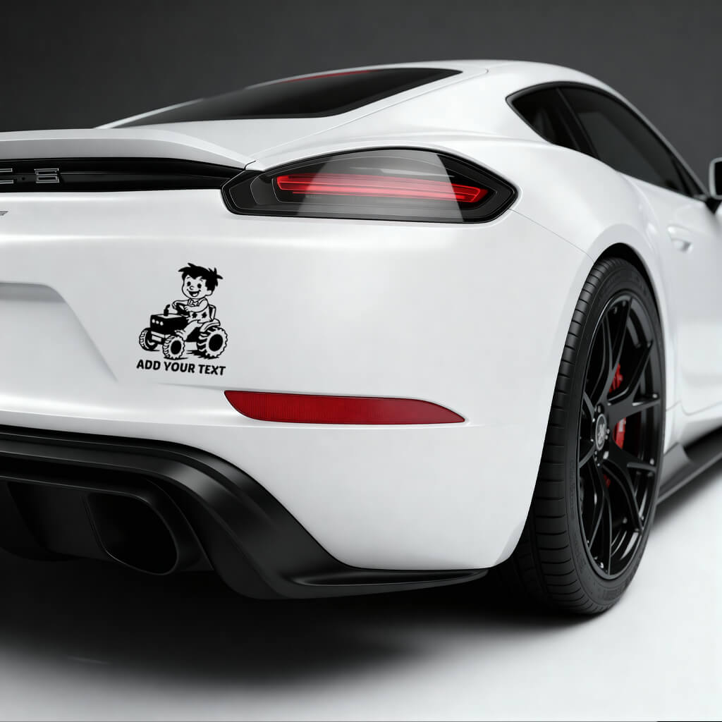 Car vinyl decal Flintstone-style cartoon boy driving tractor