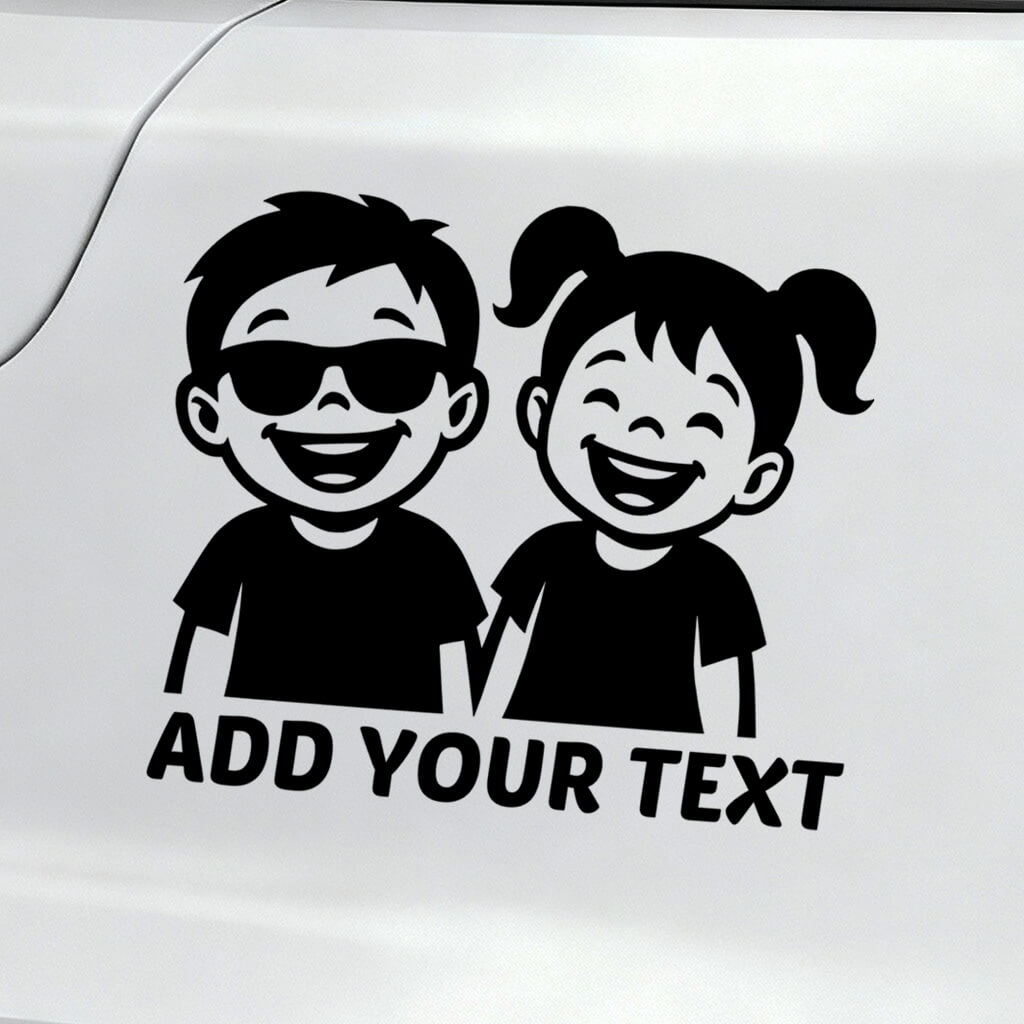 A fun car sticker showing a happy boy wearing sunglasses next to a laughing girl with pigtails. This cool design adds a playful and family-friendly vibe to your vehicle, perfect for parents who love unique kid-themed decals.